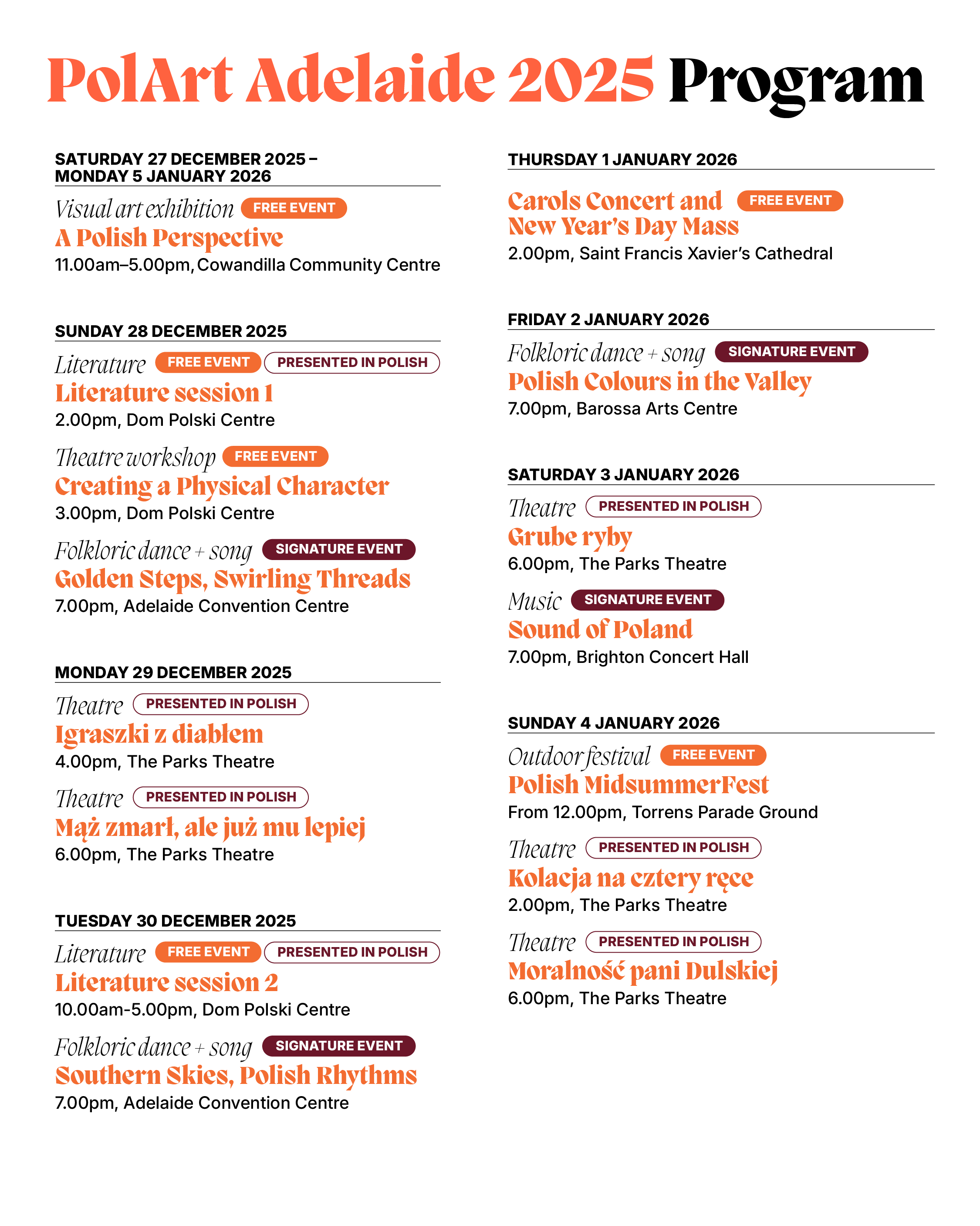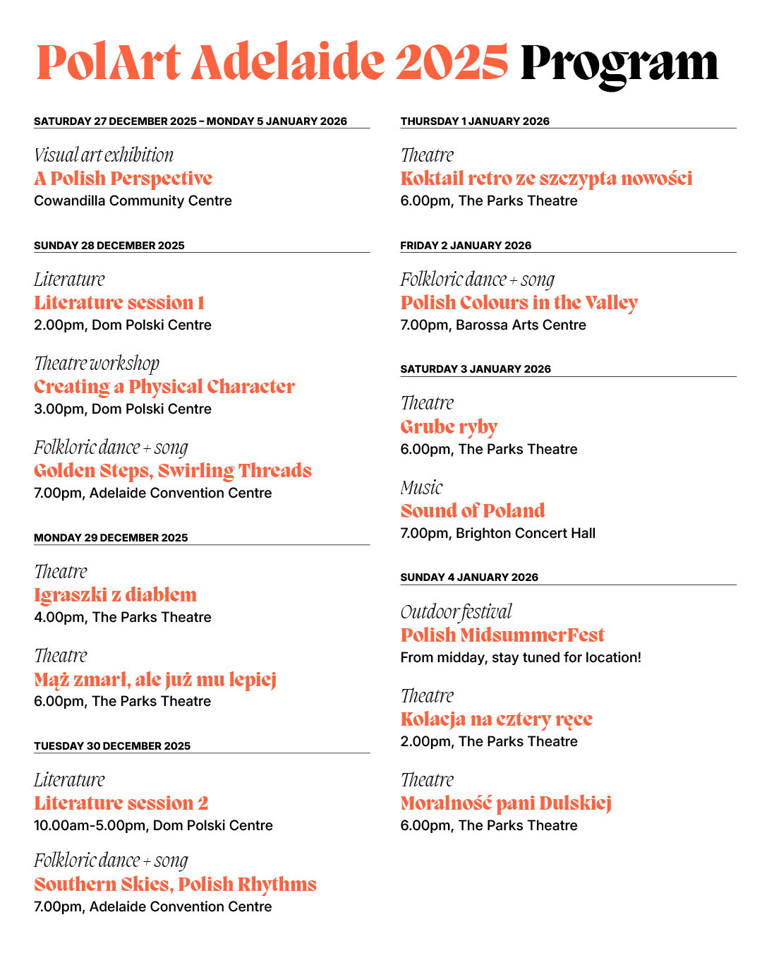 Since 1975, PolArt has been the pre-eminent stage for Polish visual, performing and literary arts in Australia and New Zealand, and an important platform for the Polish diaspora to creatively express long-standing traditions.
